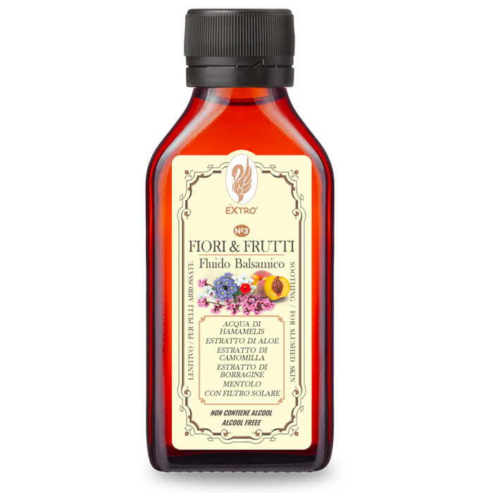 Líquido balsámico sin alcohol. Gracias al agua de Hamamelis y a los aceites que contiene, el fluido balsámico Extrò Cosmesi tiene una acción descongestionante, calmante y refrescante.