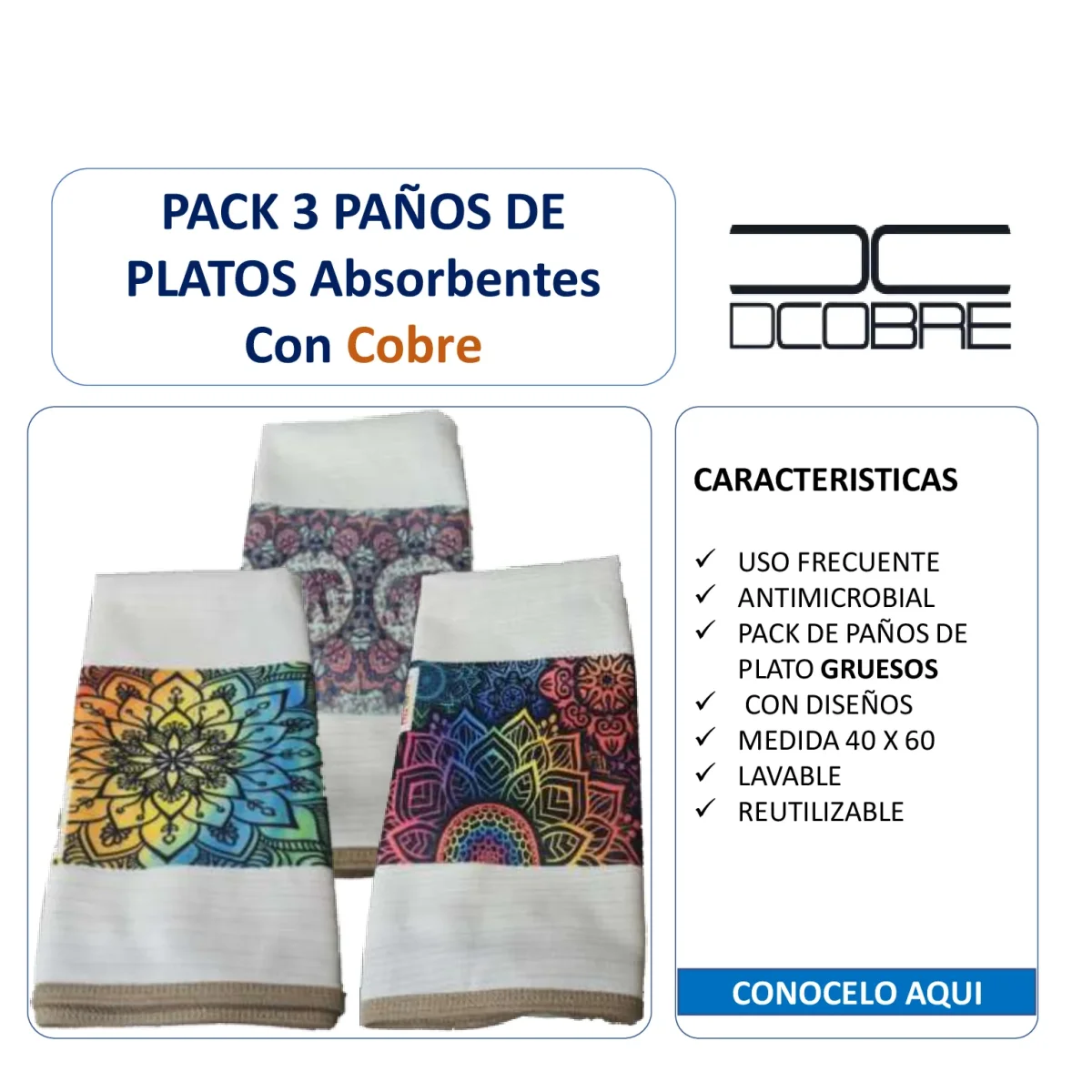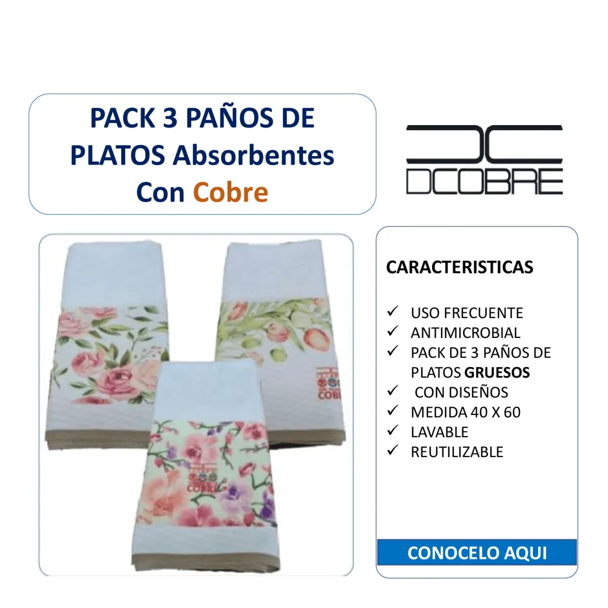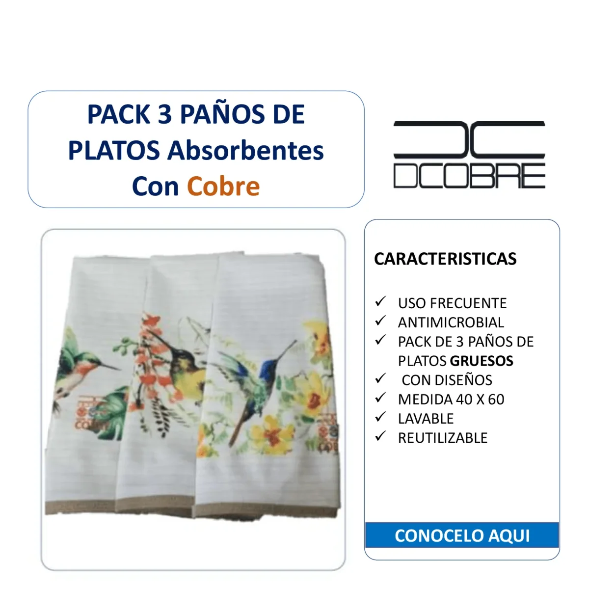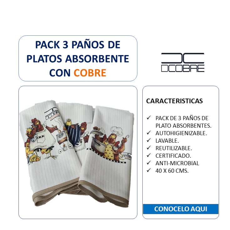 NUEVO Pack 3 Paños platos Algodón y Cobre, COLIBRÍ.
