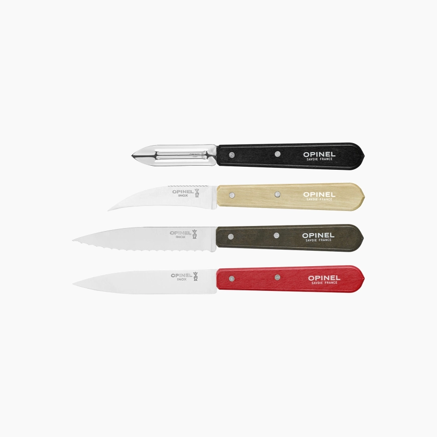 Eficacia, praticidad et manejabilidad: la caja Trio les Essentiels + reagrupa un cuchillo de puntilla, un cuchillo de sierra y un pelador. Con sus mangos de polimero de colores, resistentes al lavavajillas, aportarán un toque alegre a tu cocina.