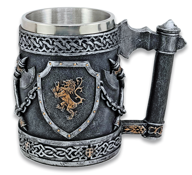 La Taza Templaria XL es una impresionante pieza decorativa y funcional con diseño de castillo medieval y caballeros templarios en relieve. Con interior de acero inoxidable, mide 12,5 cm de alto, tiene un diámetro de 9 cm y pesa 456 g. Ideal para bebidas frías o calientes. ¡No apta para lavavajillas!