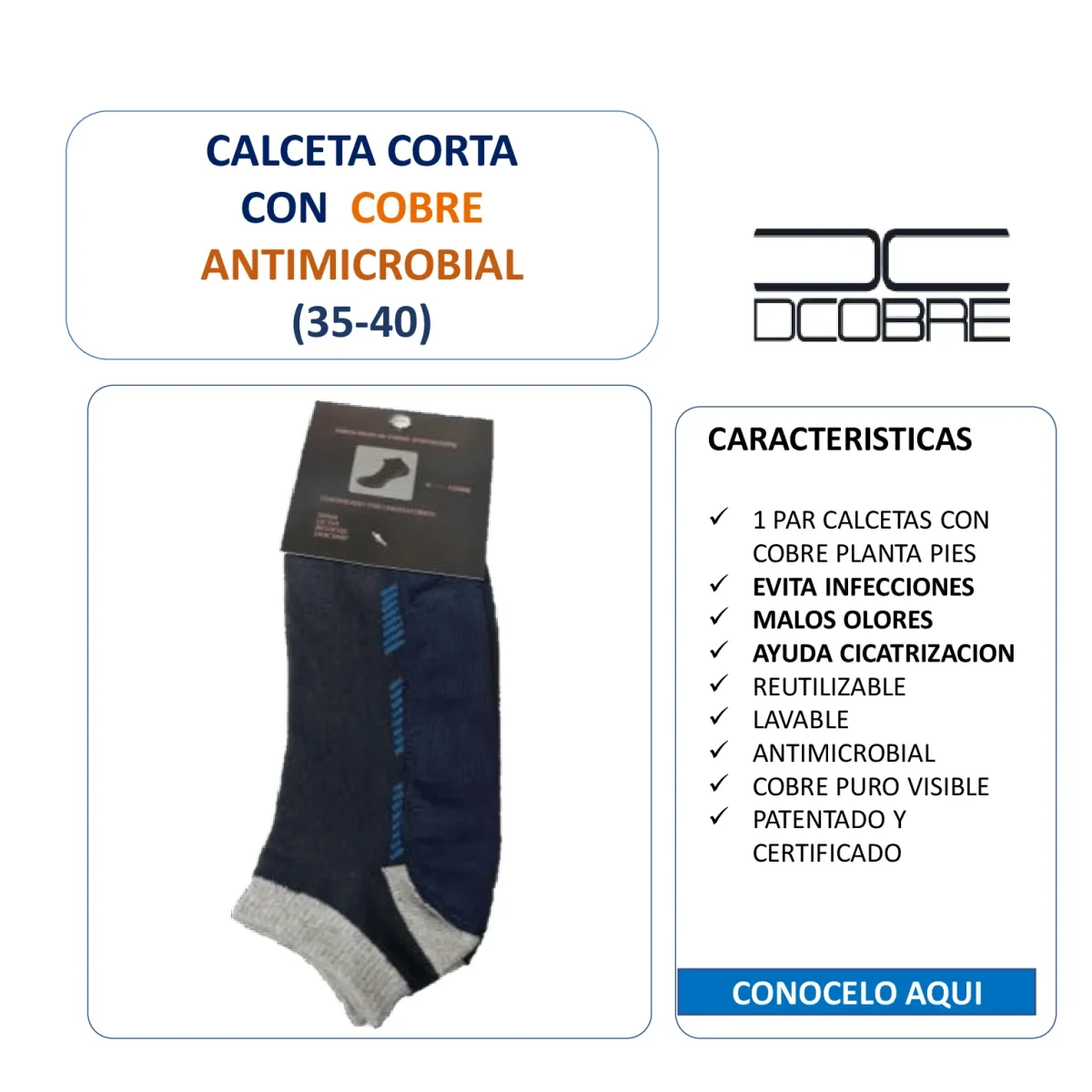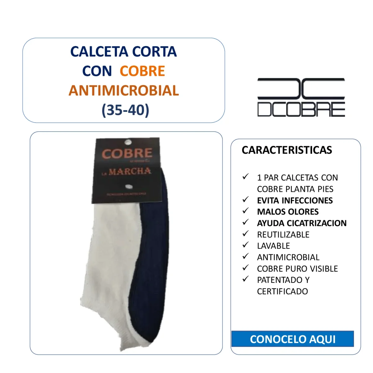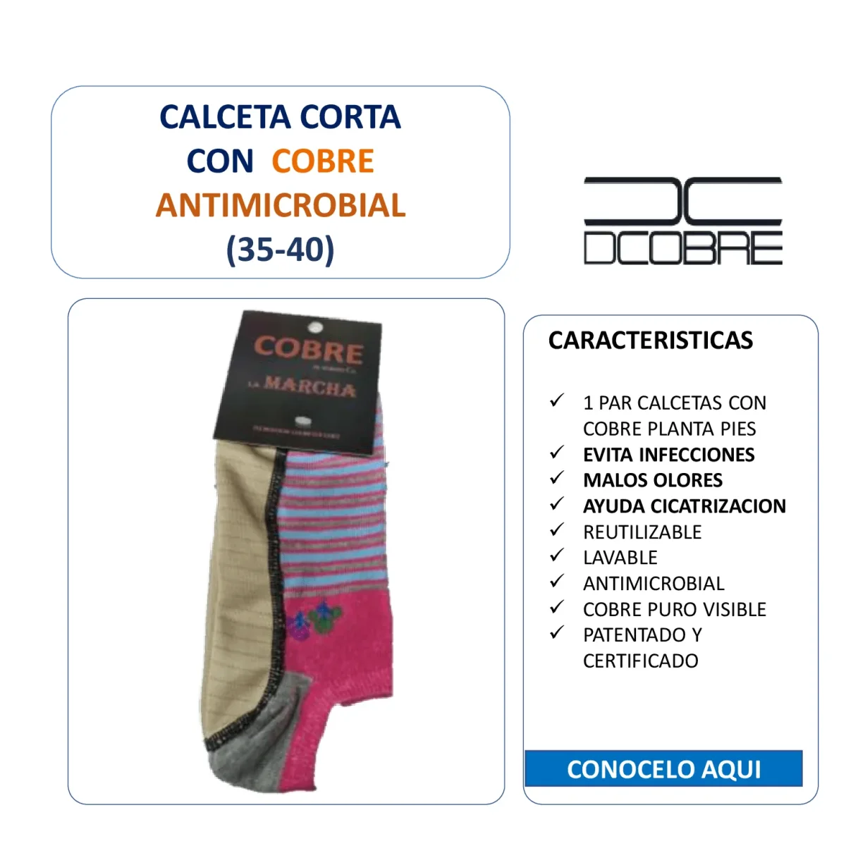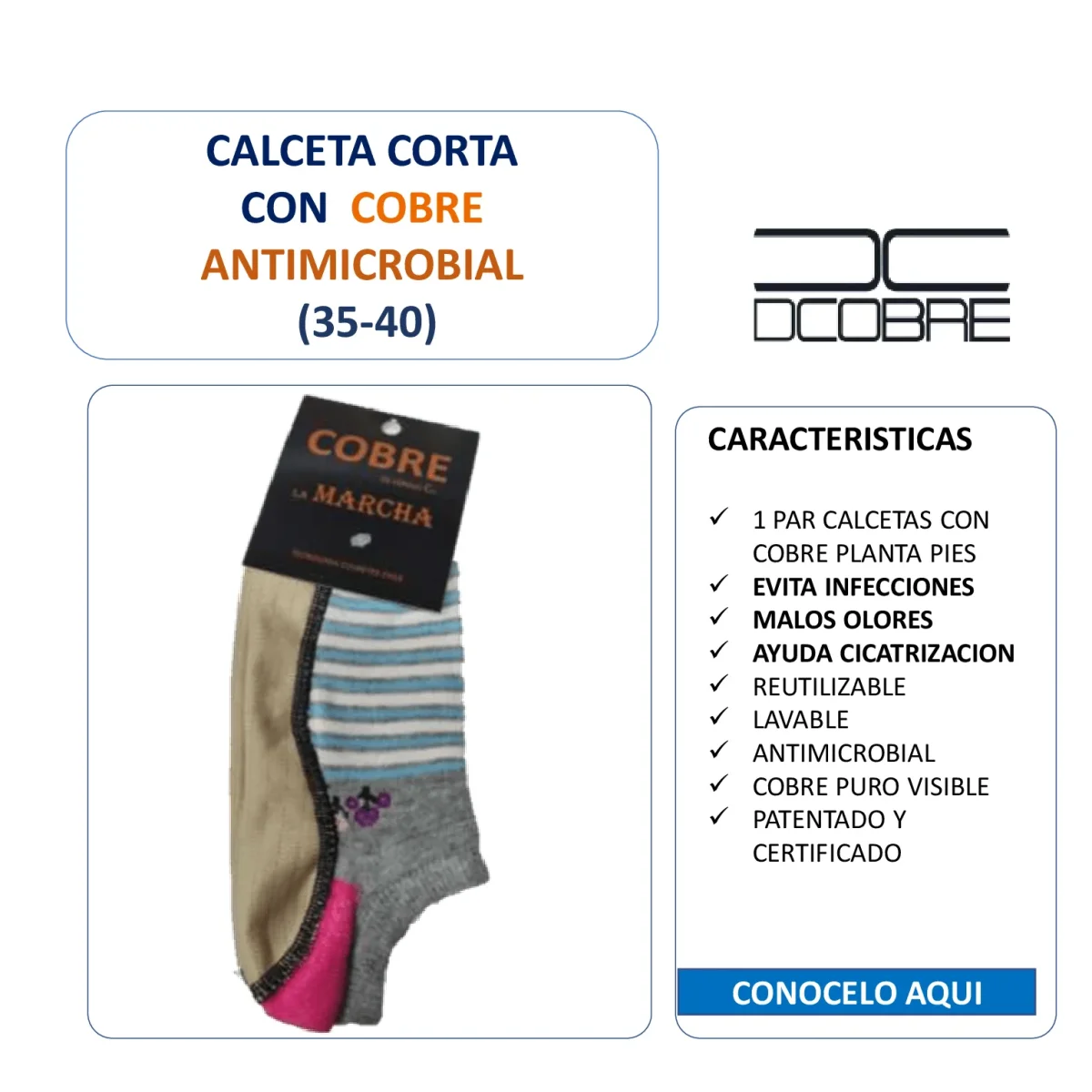 Calcetines que cuentan con tecnología de fibra de micropartículas con cobre, que ayuda a mantener los pies frescos y protegidos de infecciones. La tecnología de cobre también minimiza el mal olor.