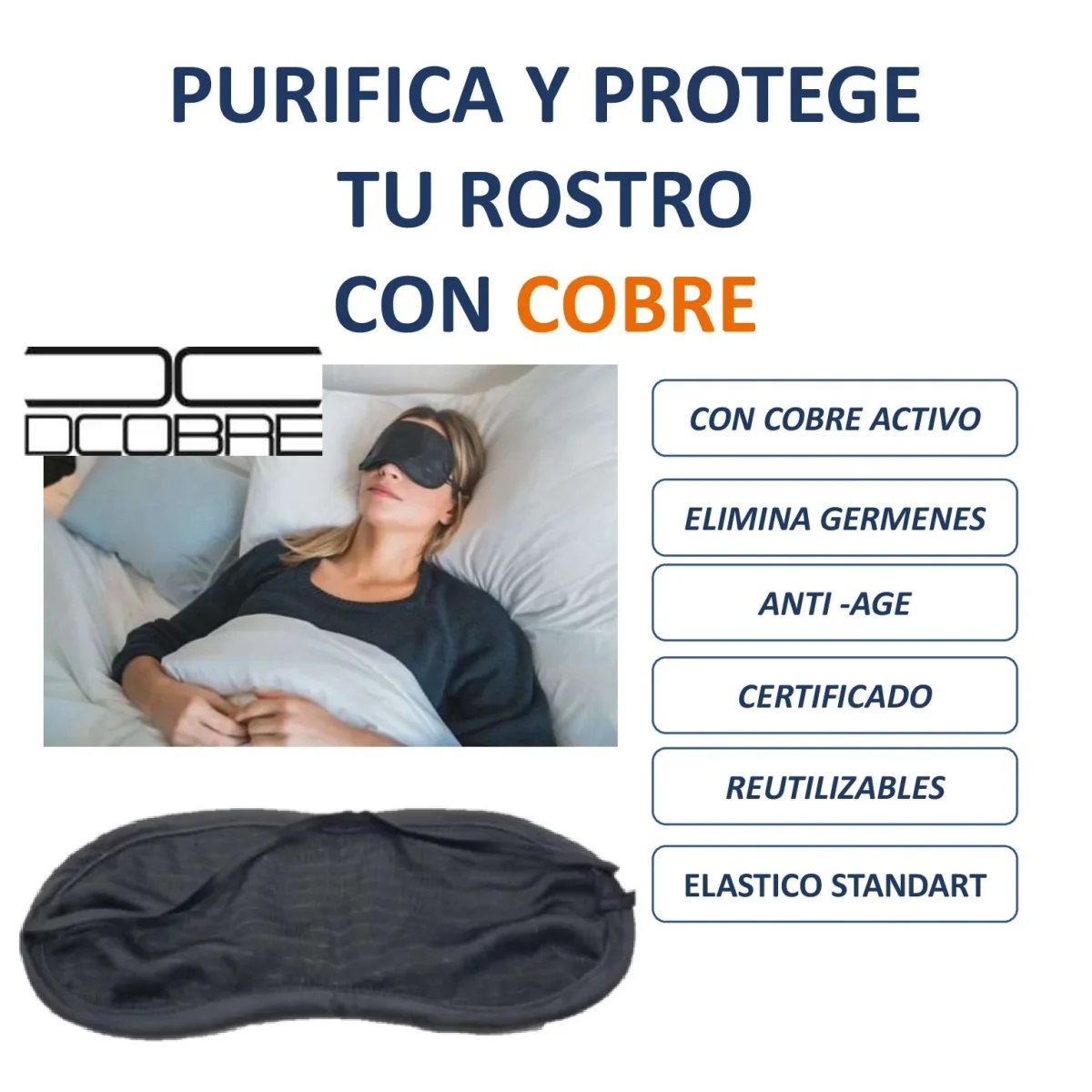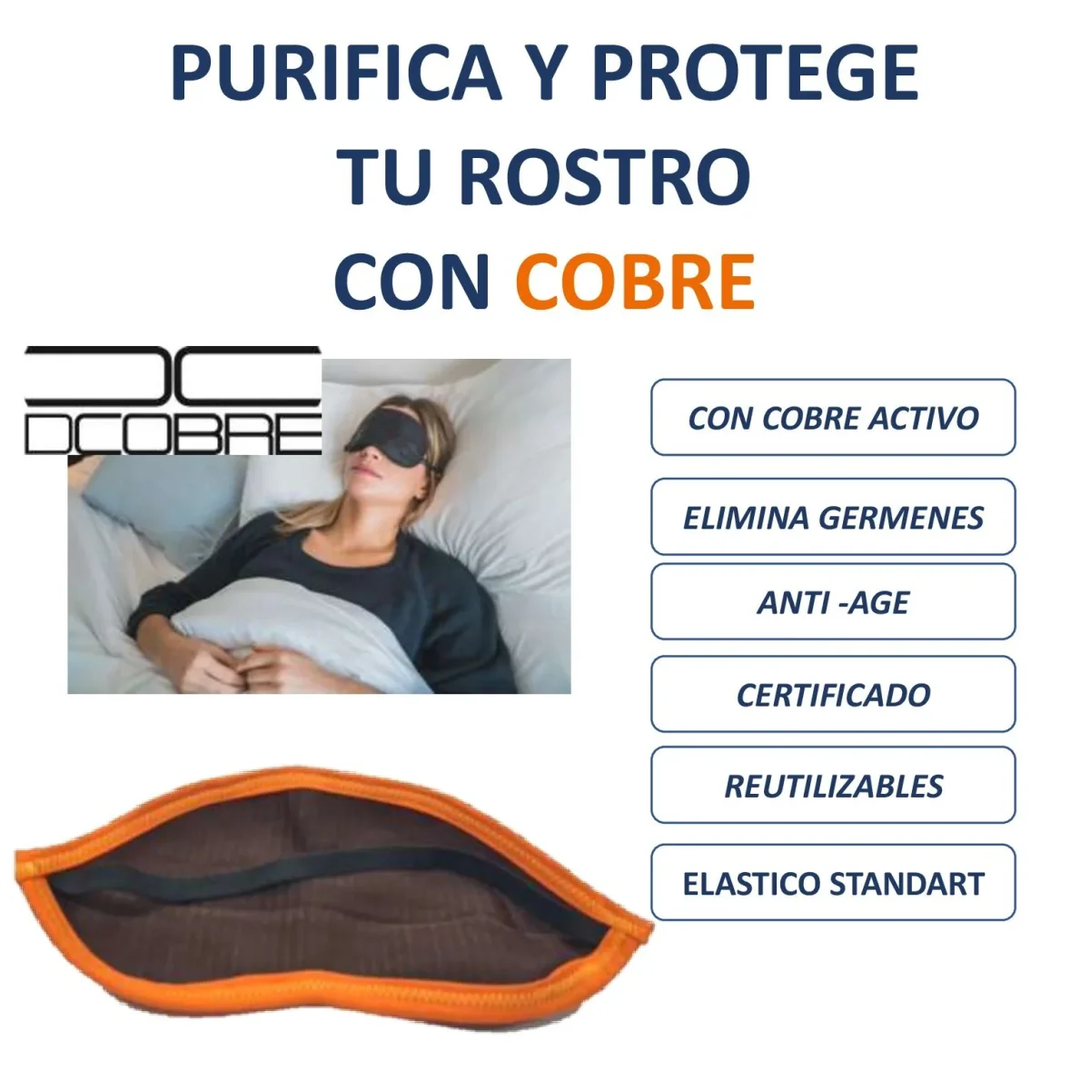Antifaz Purificador y Anti Edad con COBRE activo, estimula la formación de colágeno mientras duermes y además mantiene el rostro libre de Gérmenes de afecten la piel, manteniéndolo fresco, higienizado y libre de impurezas.