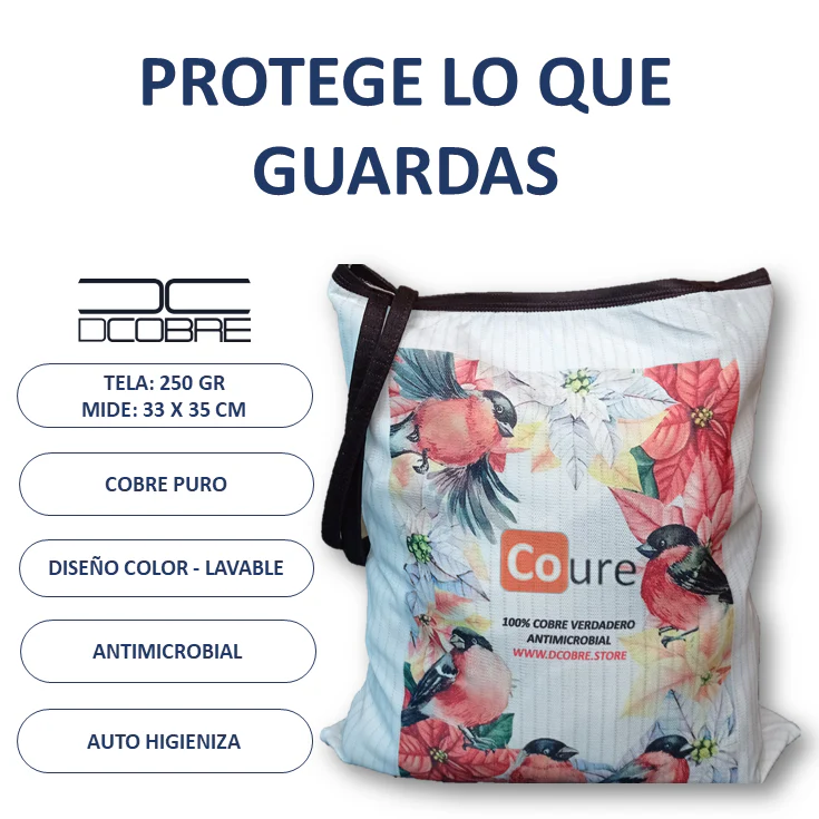 Bolsa Reutilizable con protección activa de cobre elaborada con tela CoureTex la cual es fabricada por Textil Coure, telas con la capacidad de mantenerse higienizada en forma autónoma y natural gracias a las propiedades del cobre puro que va tejido dentro de las fibras del tejido.