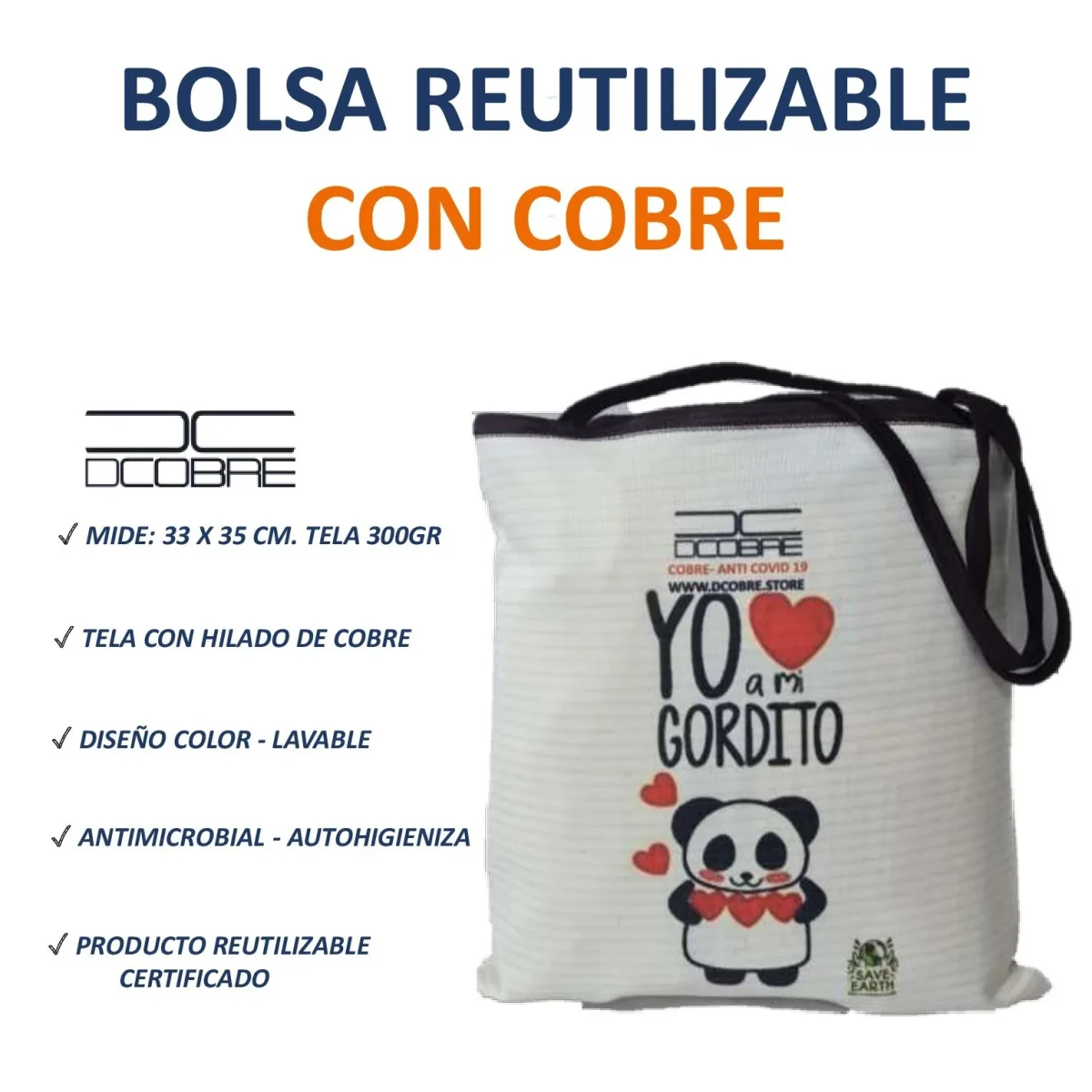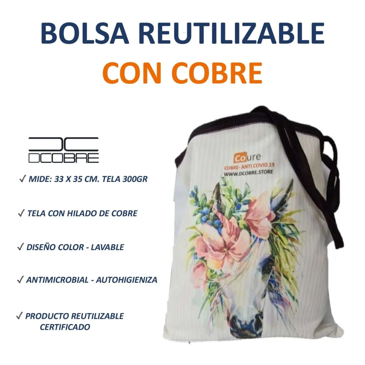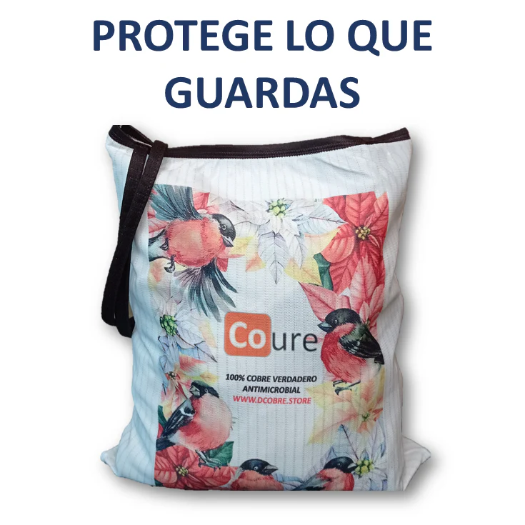 Bolsa Reutilizable con protección activa de cobre elaborada con tela CoureTex la cual es fabricada por Textil Coure, telas con la capacidad de mantenerse higienizada en forma autónoma y natural gracias a las propiedades del cobre puro que va tejido dentro de las fibras del tejido.