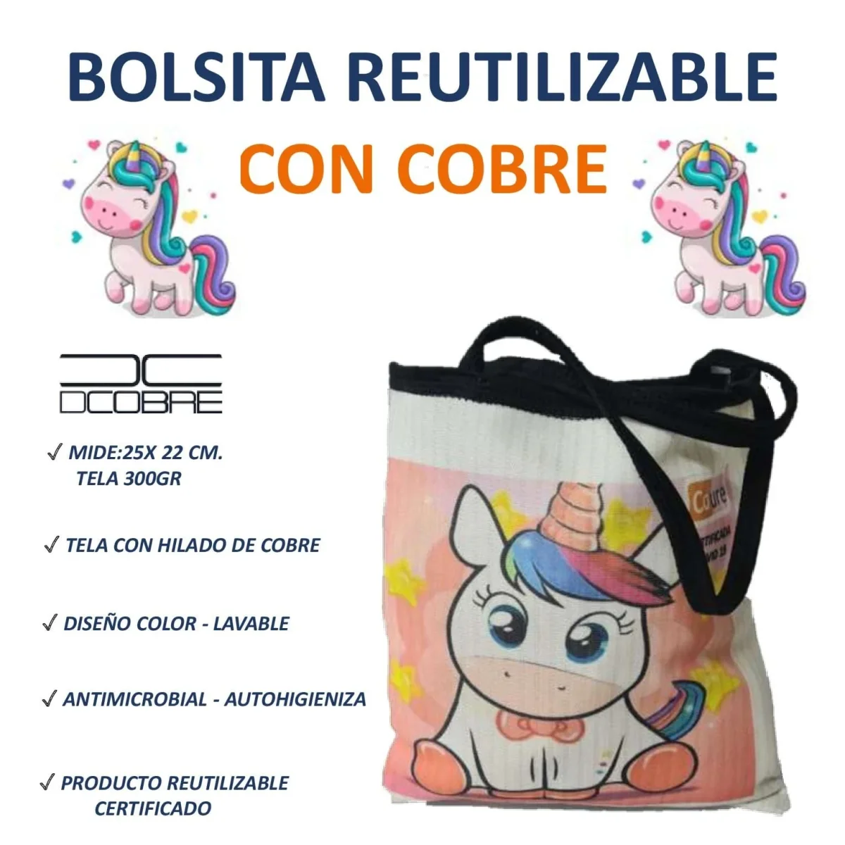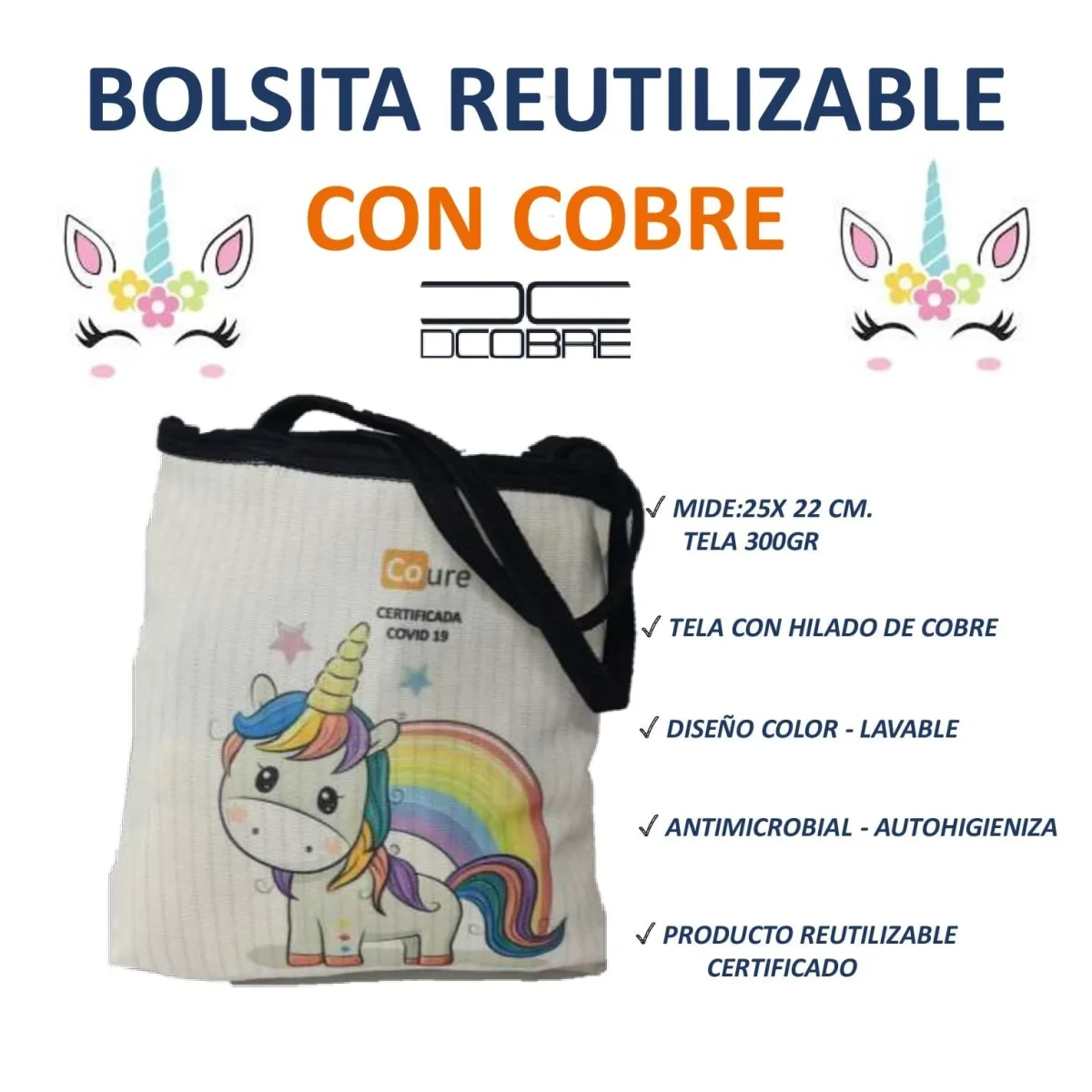 Bolsa Reutilizable con protección activa de cobre elaborada con tela CoureTex la cual es fabricada por Textil Coure, telas con la capacidad de mantenerse higienizada en forma autónoma y natural gracias a las propiedades del cobre puro que va tejido dentro de las fibras del tejido.