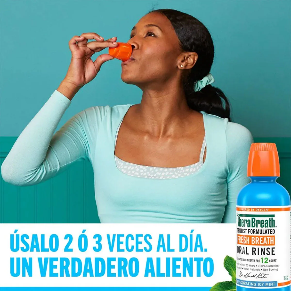 - COMBATE EL MAL ALIENTO: El enjuague bucal TheraBreath Fresh Breath combate el mal aliento durante 24 horas cuando se usa cada 12 horas después del cepillado.