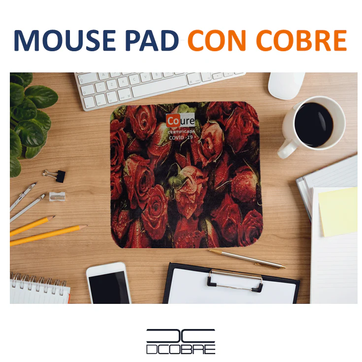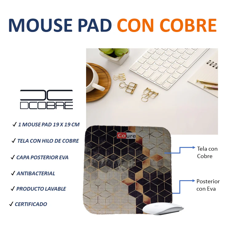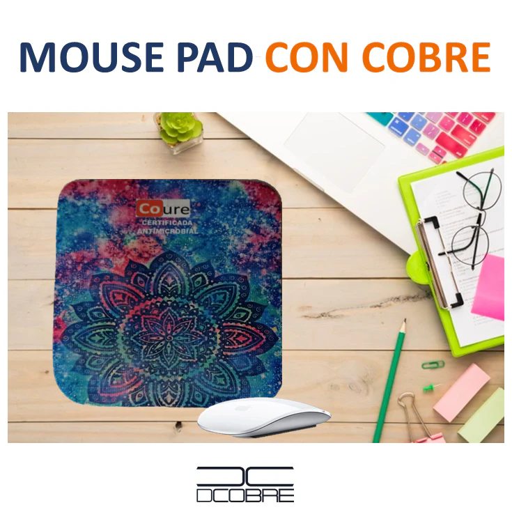 Mouse Pad, fabricados en su capa superior tela CoureTex por Textil Coure, con la capacidad de proteger en forma autónoma y natural gracias a las propiedades el Cobre puro que va tejido dentro de sus fibras, además posee una capa posterior en goma Eva perforada.