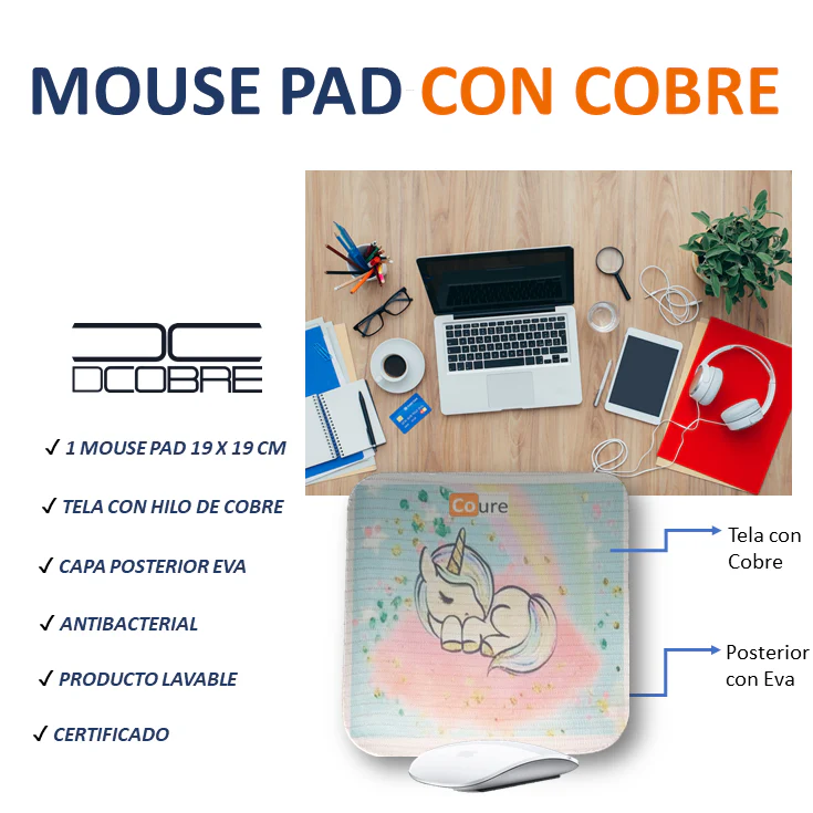 Mouse Pad, fabricados en su capa superior tela CoureTex por Textil Coure, con la capacidad de proteger en forma autónoma y natural gracias a las propiedades el Cobre puro que va tejido dentro de sus fibras, además posee una capa posterior en goma Eva perforada.