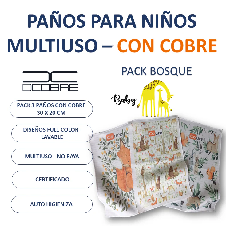 Pack de 3 Paños Poliéster/Algodón fabricados con tela CoureTex el cual es fabricada por Textil Coure, con la capacidad de proteger en forma autónoma y natural gracias a las propiedades del Cobre puro que va tejido dentro de las fibras del tejido.