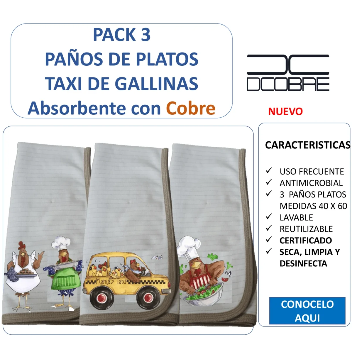 Pack 3 paños de platos absorbente TAXI DE GALLINAS , tela cobre activo (grueso).