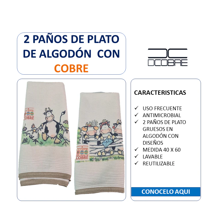 Pack 2 paños de platos Polycotton Cobre. elimina olores y germenes Diseño Vaquitas.