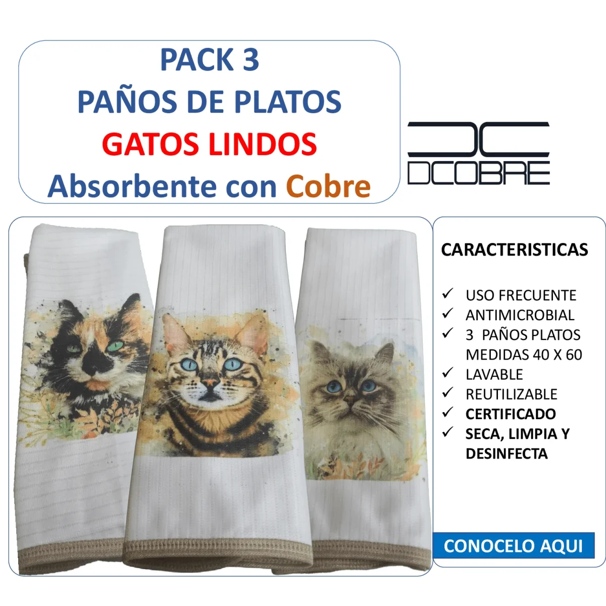 Pack 3 paños de platos absorbente GATOS LINDOS , tela cobre activo (grueso).